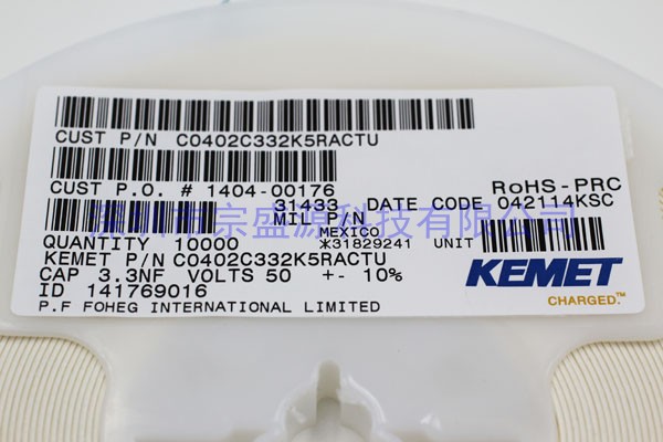 產品名稱:KEMET電容 0402 50V 3.3NF C0402C332K5RACTU